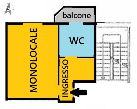 In posizione tranquilla, appartamento di 36 mq. al piano primo composto da ingresso con disimpegno, ampio monolocale, bagno con portafinestra, balcone ed annessa soffitta.