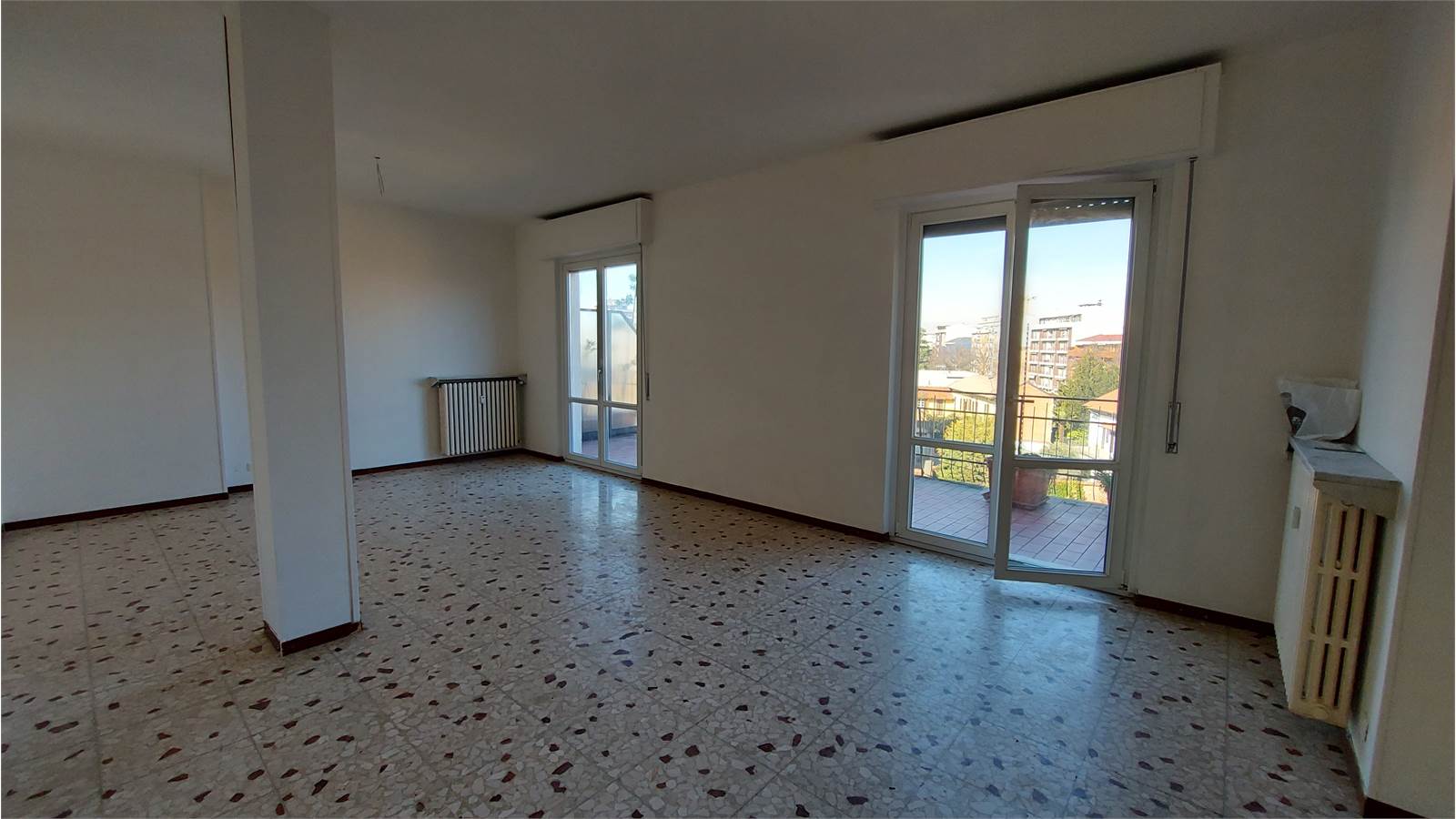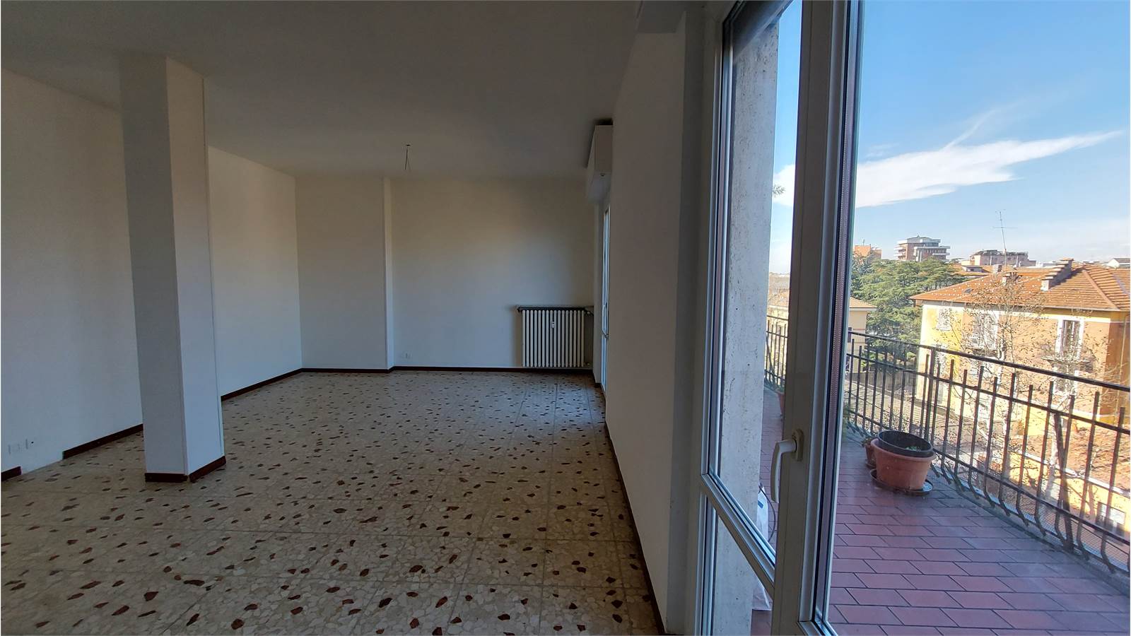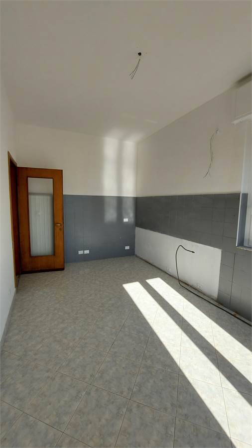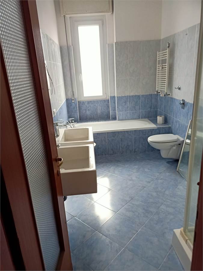 Alloggio di circa 140 mq di tre vani più servizi, composto da ingresso su ampio salone di circa 40 mq. esposto sul TERRAZZO scoperto di 25 mq., spaziosa cucina abitabile con balcone, corridoio nella zona notte con grande armadio a muro, due camere da letto, bagno con vasca e doccia, ripostiglio.